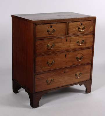 the rectangular top over two short and three graduated cock beaded long drawers, raised on bracket feet