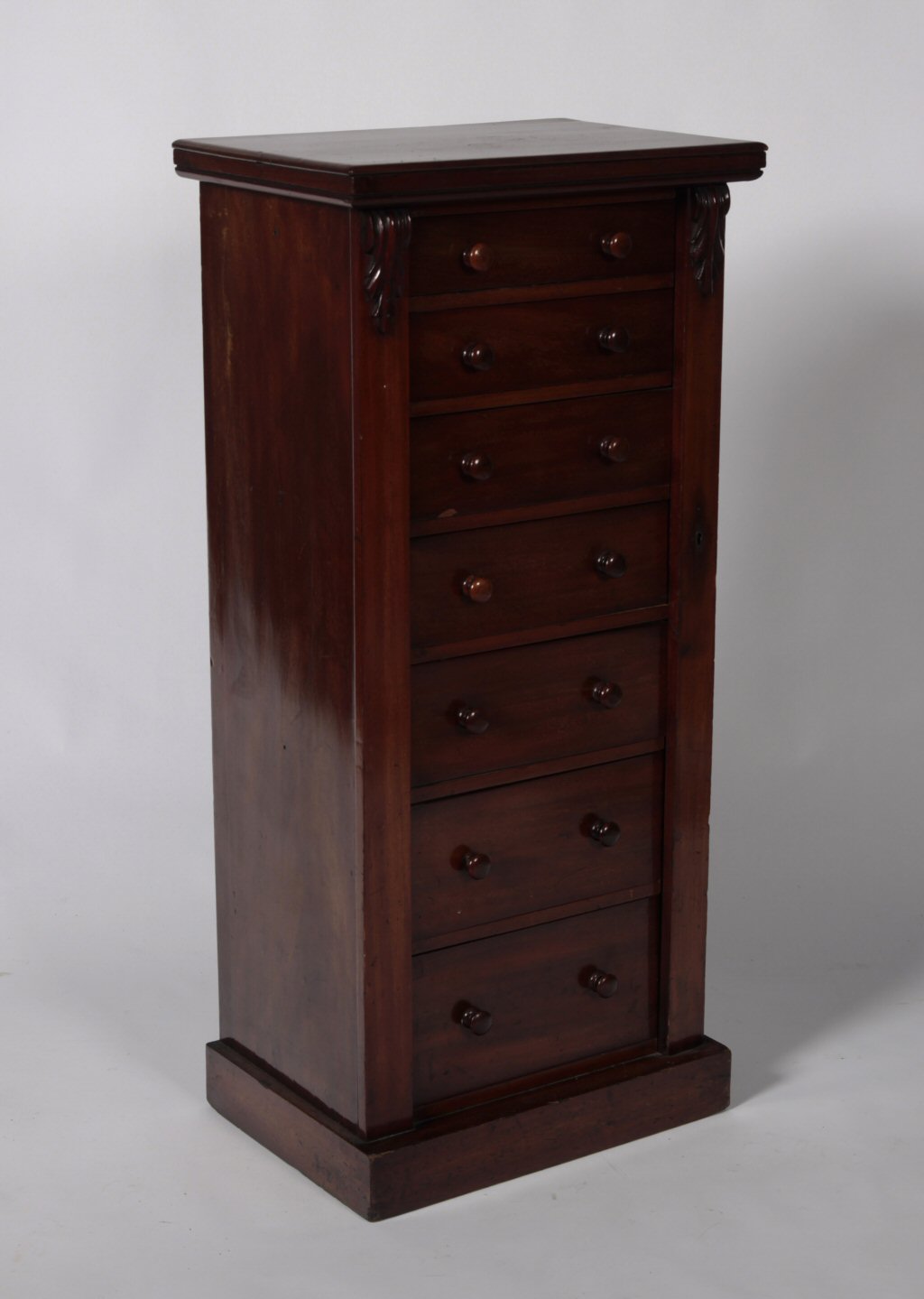 the moulded rectangular top over seven graduated drawers, flanked by acanthus carved brackets, raised on plinth base
