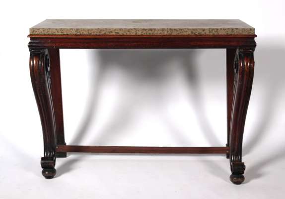the rectangular top over ogee frieze panel raised on moulded cabriole legs terminating in C-scrolls, with bun feet