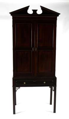 the broken pediment over a beaded frieze panel, over two panelled doors enclosing a combination of drawers and pigeon holes, beaded frieze drawer, raised on serpenting square legs with pierced fretwork brackets