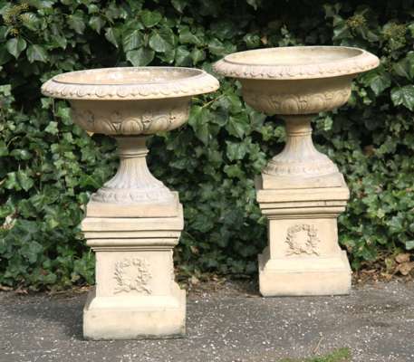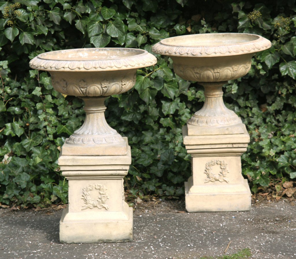 each with scalloped rim over fluted waist, foliate tapering foot, raised on square plinth embossed with wreaths