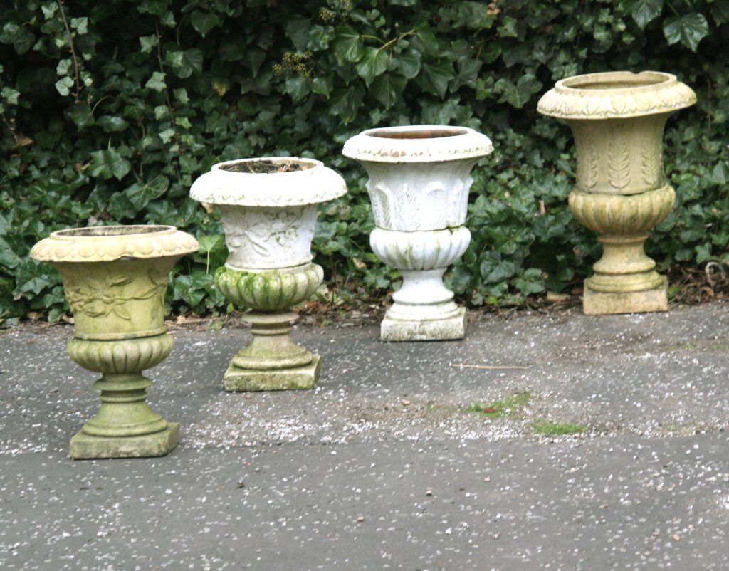each of tapering cylindrical form, gadrooned base, flared foot, raised on square plinth base (4)