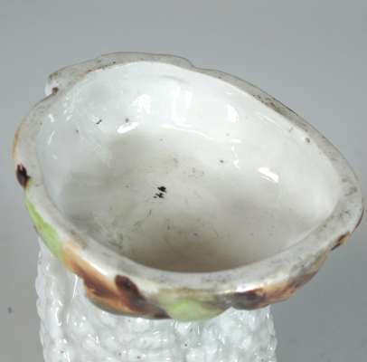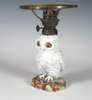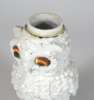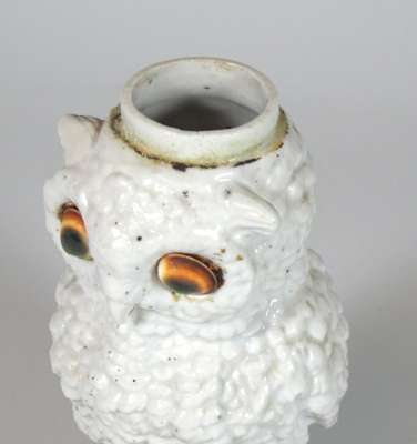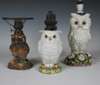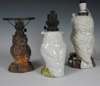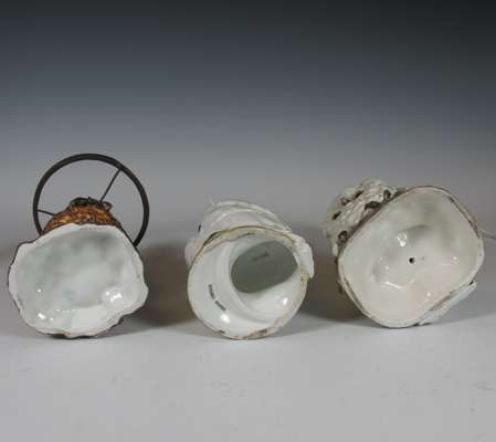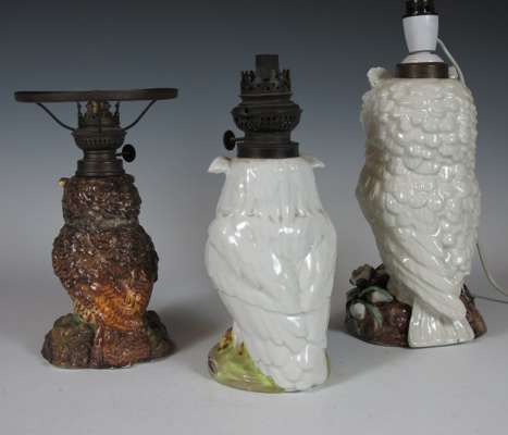 with operculum eyes, standing on a naturalistic base, 22cm high; and three later owls, comprising: a William Whiteley white glazed china oil lamp, standing on a naturalistic base, printed mark, 26cm high; a Sitzendorf china oil lamp, brown glazed on a naturalistic base, blue painted mark, impressed number '78', 24cm high; and a white glazed electric lamp with applied floral base, impressed mark, 33cm high (4)