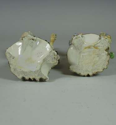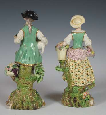 each painted in polychrome on a gilt scroll base, inscribed 'No 56', the man holding a lamb and a posy, the lady carrying a basket of flowers (2)