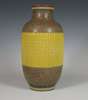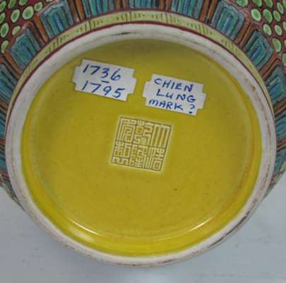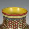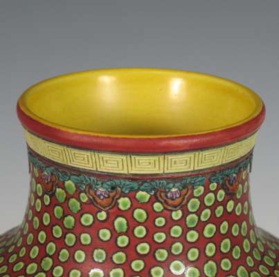 of ovoid form, decorated with a central yellow bamboo border between bands of green spots on a red ground, impressed Qianlong seal mark to base, but later