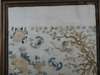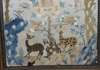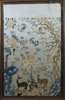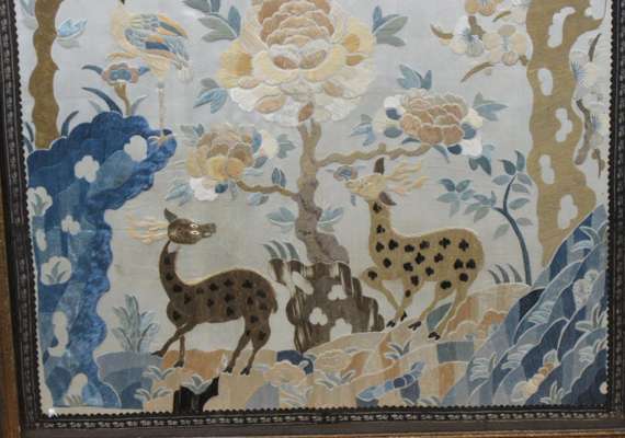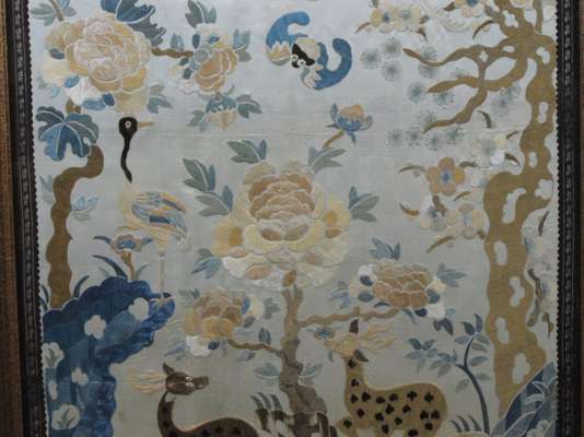 of rectangular form decorated with deer, bats, cranes, peonies and a pine tree in blue yellow and white on a grey ground
