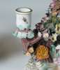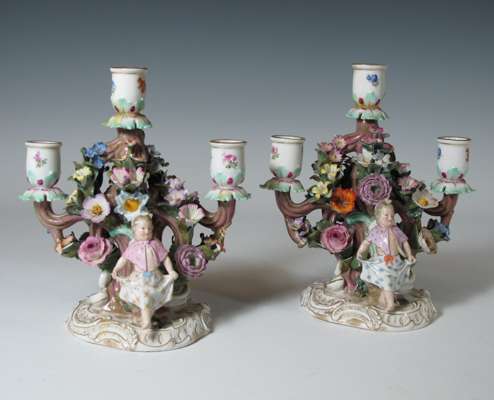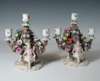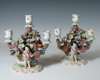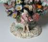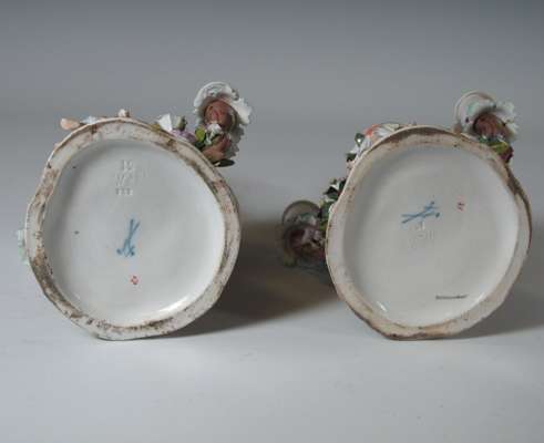 each decorated with two figures around a tree trunk which is profusely covered with flowers, on a rococo scroll base, blue painted crossed sword mark and incised marks to base (2)