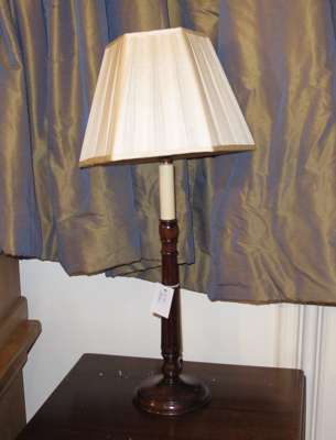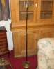 each of cylindrical form on a plain stepped sircular base, 98cm high; a pair of mahogany lamps, each with a fluted column over a plain stepped circular base, 45cm high; a Gothic style brass lamp with wrythen column over a circular stepped base, 56cm high; and a telescopic brass fender, 148cm wide (6)