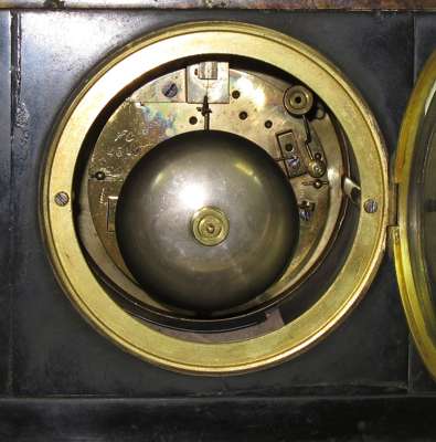 the movement striking on a bell, the white dial with black Roman numerals, the slate case with scrolled sides and bands of red marble