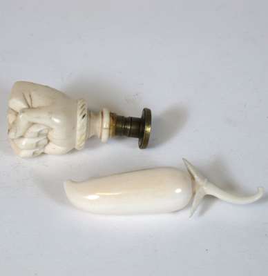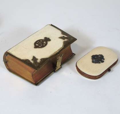 of tapered cylindrical form, with engraved shield, 13cm high; a horn quaich, 10.5cm wide; a leather pear shaped string box, 8.5cm high; an ivory and gilt metal mounted book of Church Services, 10cm long; an oval ivory purse, 7.5cm wide; a carved ivory chili pepper, 7cm long; and a carved bone seal of a clenched fist, 5cm long (7)