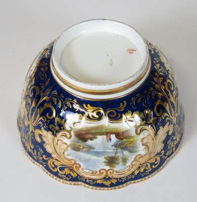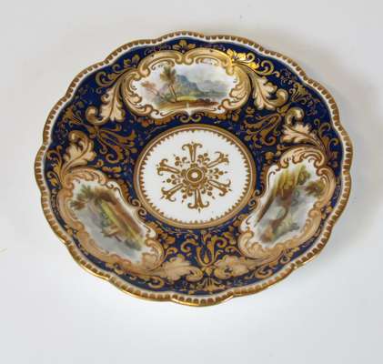 each with painted landscape scene on a blue ground with gilt foliate scroll highlights, pattern number '5/1991', comprising: twelve saucers, twelve tea cups (one with broken handle), eight coffee cups and a slop bowl (33)