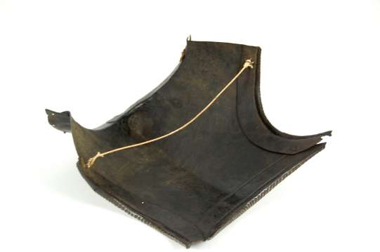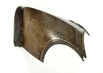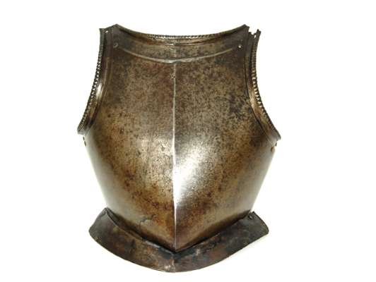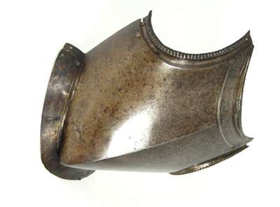 flanged at the base with a later additional flange, the neck roped, the arm holes are riveted flanges to the plate and with roped rolled edges, a raised band at the neck terminates in two rivets for the arm holes, with associated tassets