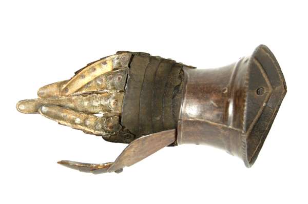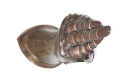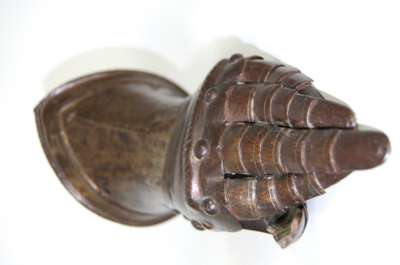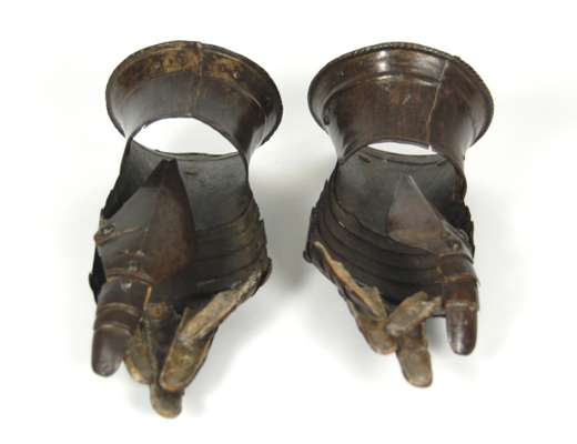 with minor differences, flared cuffs rope-turned borders, four downward turning knuckle plates, later finger-plates bordered by incised lines and riveted to buff leather (2)