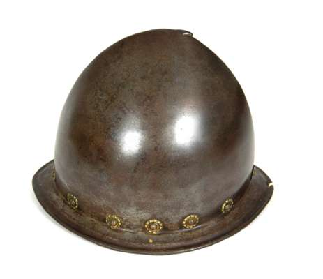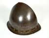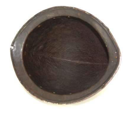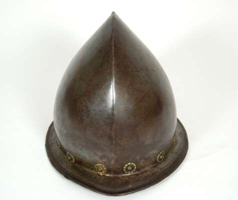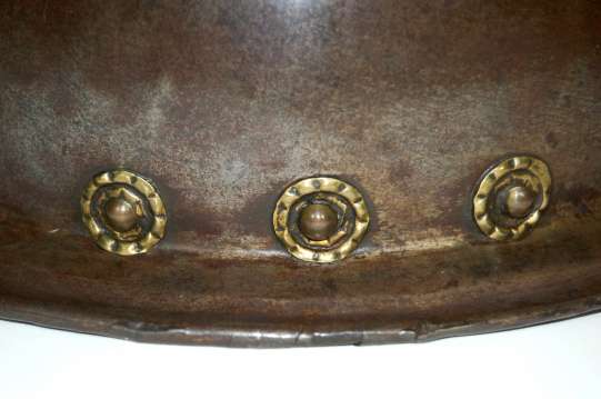 with tall pear shaped one piece skull with short stalk at apex, retaining all its flower head rivets, missing lining