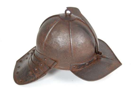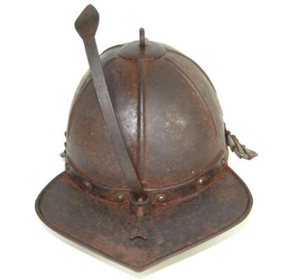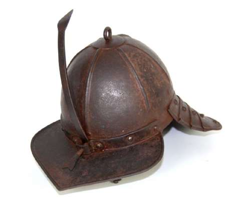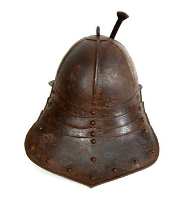 the one piece skull divided into six sections with a raised band dividing them, the crown topped with an iron ring, fixed lobster tail neck guard, large leaf-shaped front peak, missing ear flaps and liner with original nasal bar and screw