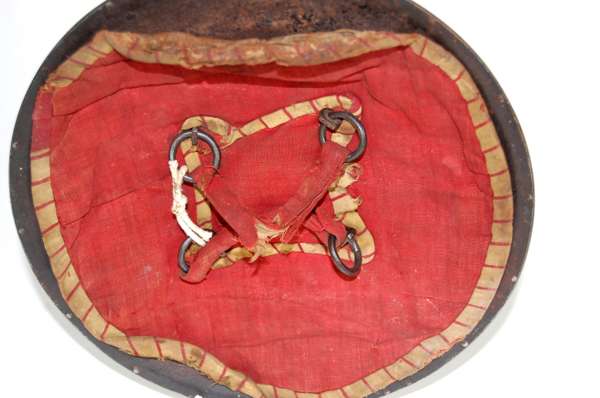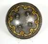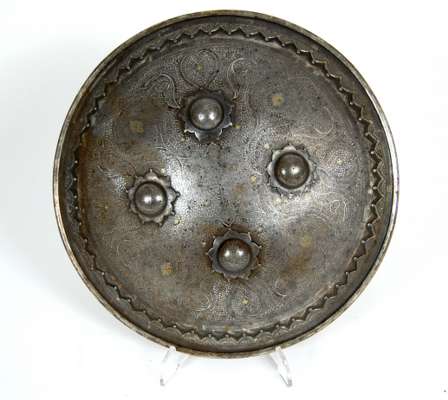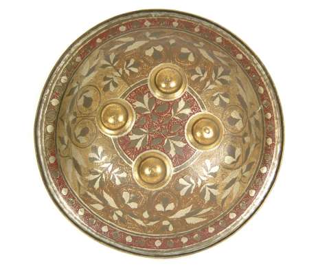 the largest with all over foliate damascening with four raised gilded brass bosses, 36cm diameter; the two smaller shields decorated with neillo work in Islamic shapes and one shield with applied brass flower heads and bird like figures drinking from them both with original red linen liners and hand grips, 23cm diameter (3)