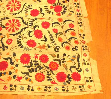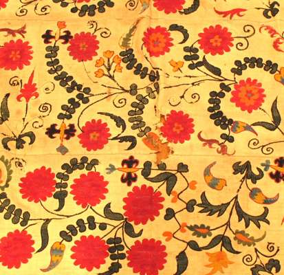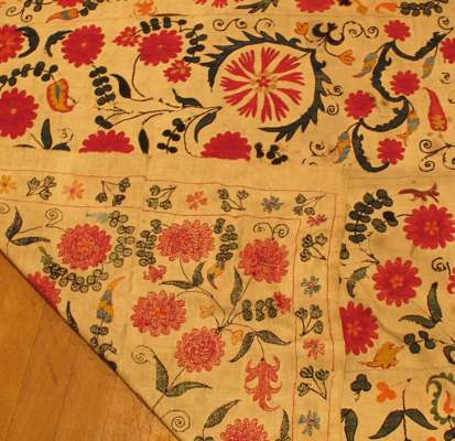 late 19th/ early 20th century, woven in five sections with allover purple rosette and vine pattern, within similar border