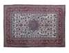 mid 20th century, the cream field with central red and blue cusped medallion suspending pendants, within red palmette and foliate vine border between bands