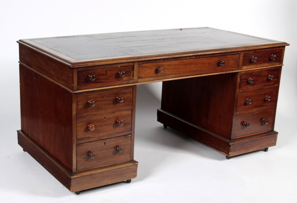 the moulded rectangular top with tooled green skiver, over a long frieze drawers flanked by four short drawers, on plinth bases with ceramic castors
