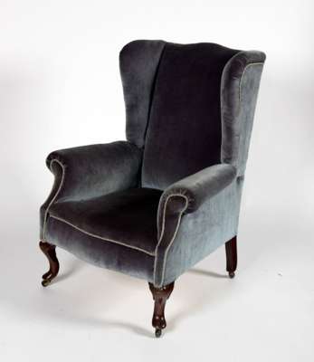 the serpentine back over scroll arms, serpentine sprung seat raised on cabriole legs terminating in pad feet with ceramic castors