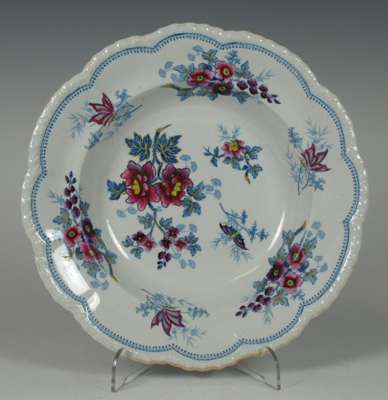 each with printed and painted floral decoration, printed marks, comprising: seventeen dinner plates, seven soup bowls, five fruit plates, two dessert bowls, three side plates and five graduated ashets (39)