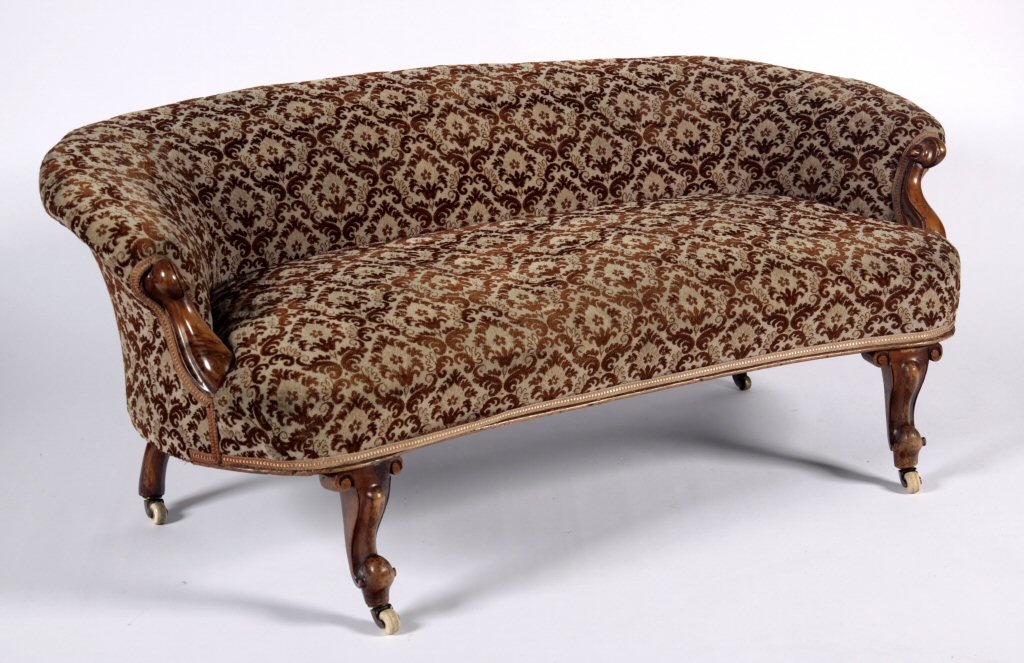 the cushioned back and arms terminating in scroll carved ends over a sprung seat, raised on cabriole legs terminating in scroll feet with ceramic castors