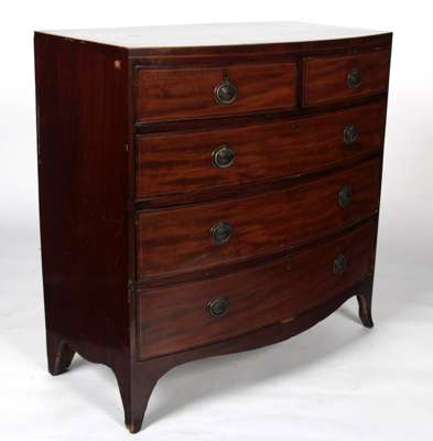 the crossbanded top over two short and three graduated ebony and boxwood strung cockbeaded long drawers, serpentine apron raised on splayed bracket feet