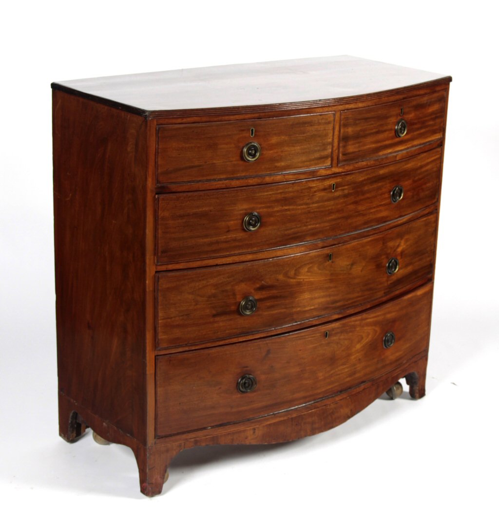 the reeded top over two short and three graduated cockbeaded long drawers, serpentine apron, raised on bracket feet