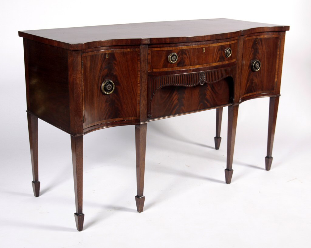 A George III style feather mahogany serpentine sideboard Retailed by Heals