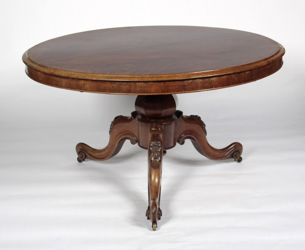 the round moulded top raised on a multi-facetted baluster support, over foliate carved cabriole legs and brass casters