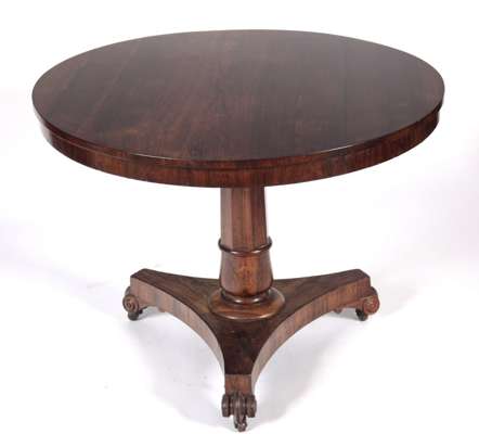 with plain frieze raised on tapering octagonal column waisted triangular base on scroll feet with ceramic castors