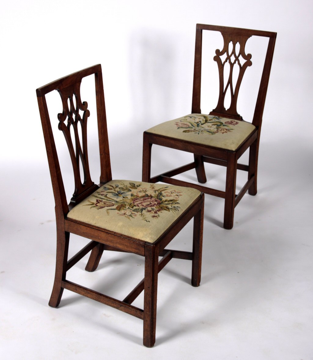 each with flat top-rail over an interlaced pierced vase shaped splat, drop-in needle point cushioned seat, raised on square legs united by stretchers (4)
