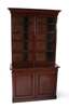 the projected moulded cornice above glazed doors enclosing shelves, the moulded lower section with hidden frieze drawer above panelled doors, enclosing shelves, raised on plinth base