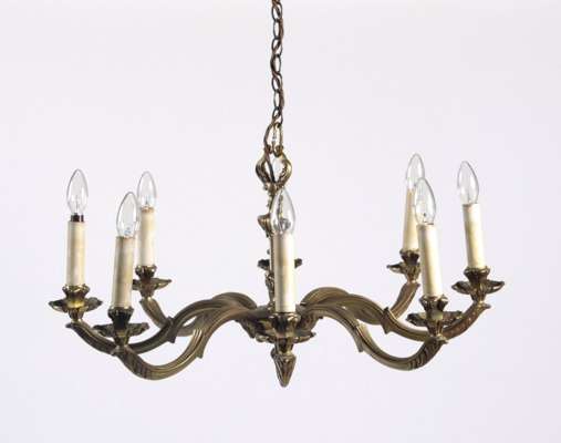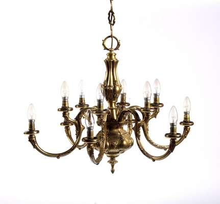 the bulbous foliate stem over two tier scrolling branches, surmounted by a squat bulbous finial, 64cm high; and another eight branch electrolier (2)