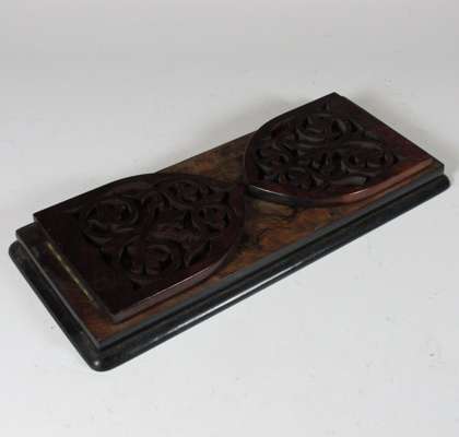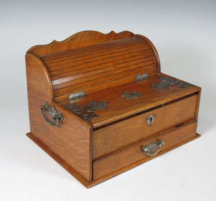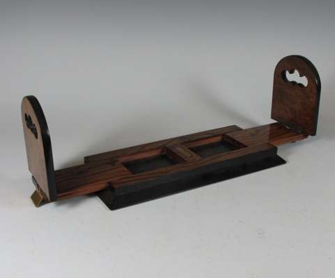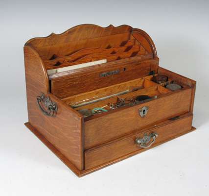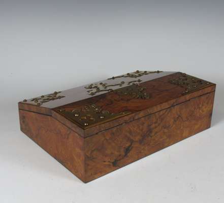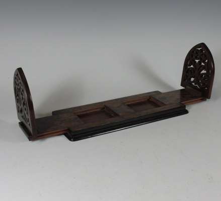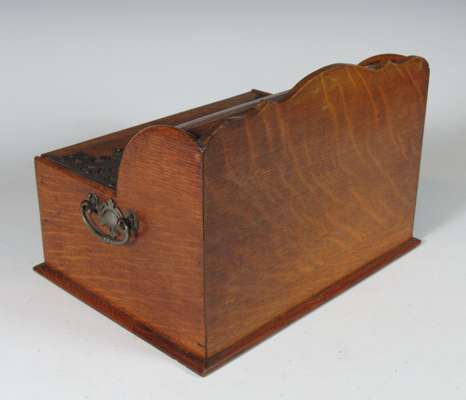 with elaborate Gothic Revival fittings, 35.5cm wide, 11cm high, 25cm deep; an oak stationary box, 31.5cm wide, 21.5cm high, 23.5cm deep; and two walnut and ebonised extending bookstands, each 33cm wide (4)
