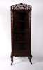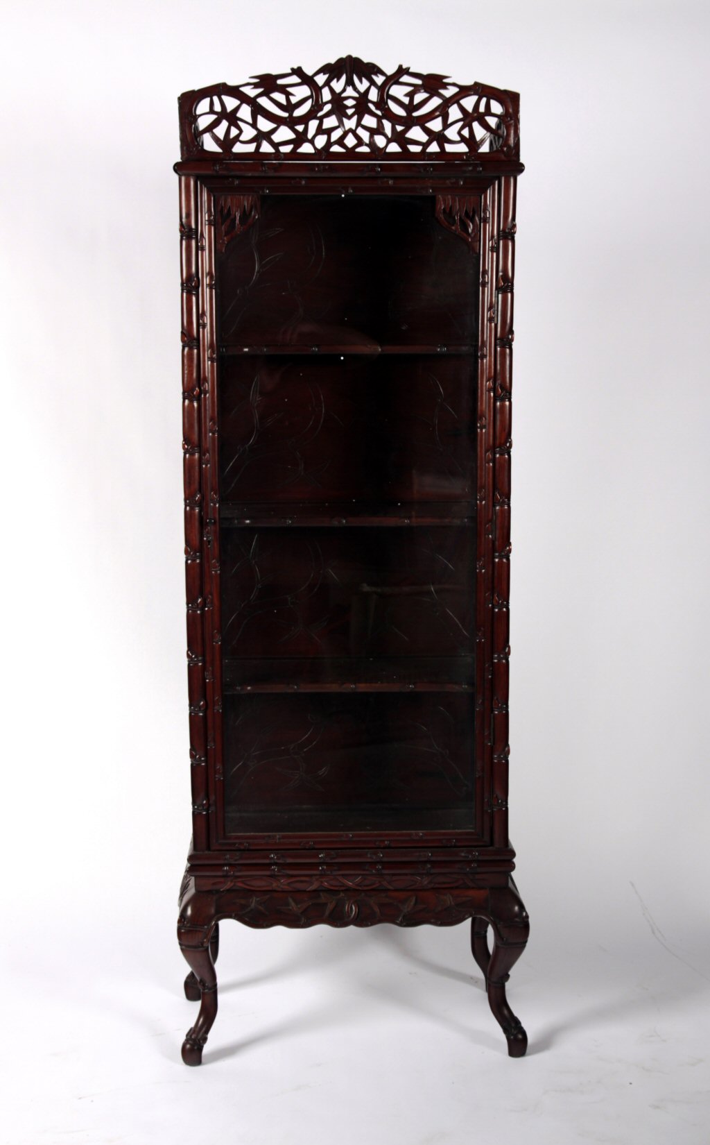 the pierced bamboo cornice over glazed doors enclosing shelves raised on cabriole legs