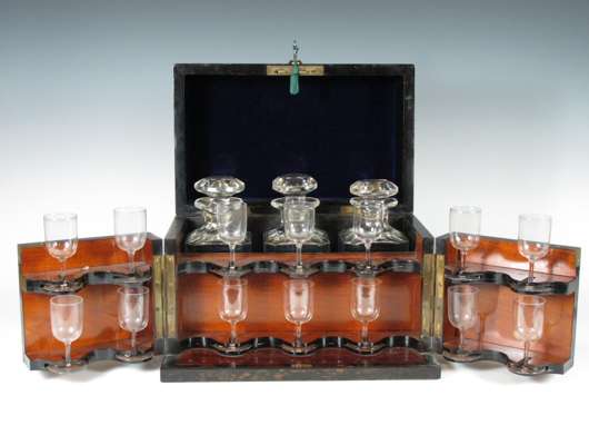 of rectangular form with gilt cartouche inscribed 'J.E. Taylor', the fitted interior with three decanters and fourteen glasses, brass plate inscribed 'Chapmans Patent/ No 197'