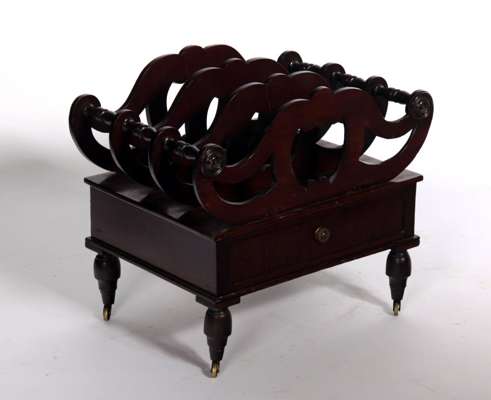 with four foliate and swag dividers united by baluster turned stretchers over a rectangular top frieze drawer raised on squat baluster turned legs terminating in brass caps and castors