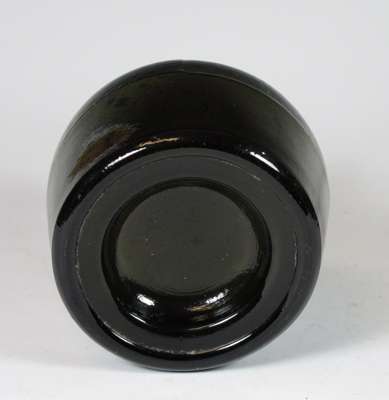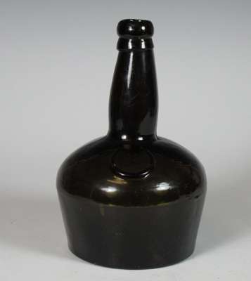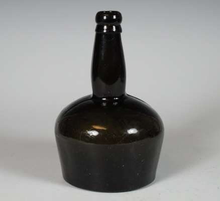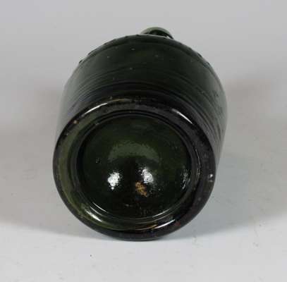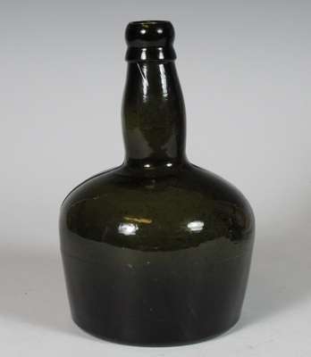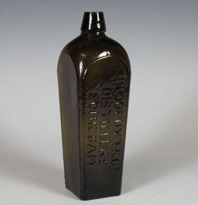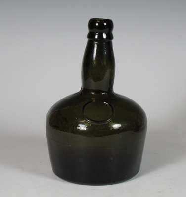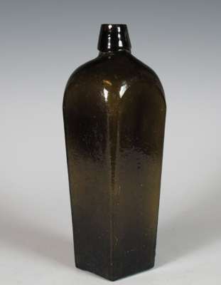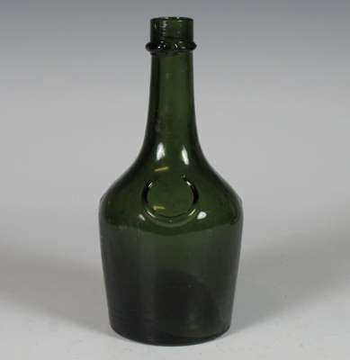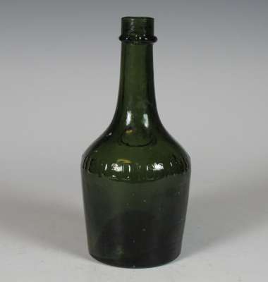 each of club form with vacant seal cartouche, 19cm high; a similar green glass wine bottle with vacant seal cartouche, marked 'Benedictine', 21.5cm high; and a green glass spirit bottle of square tapering form, marked 'Ploopuyt & Co/ Distillers/ Schiedam', 23cm high (4)