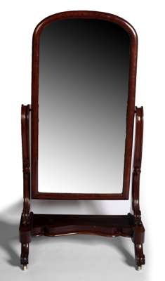the moulded arched frame enclosing mirror plate on moulded scroll supports, serpentine base, on scroll feet with ceramic castors