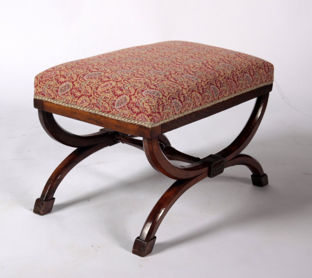 the cushioned rectangular seat raised on curved legs terminating in block feet, united by a stretcher