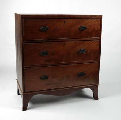 the crossbanded rectangular top over three cockbeaded long drawers, serpentine apron, raised on splayed bracket feet