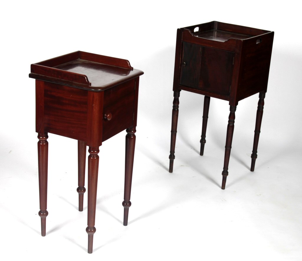 the square gallery with pierced handles over a single cupboard door raised on tapering baluster turned legs, 40cm wide, 84cm high, 37cm deep; and a Victorian mahogany pot cupboard, the three quarter gallery over a single cupboard door raised on tapering baluster turned legs, 40cm wide, 76cm high, 37cm deep (2)