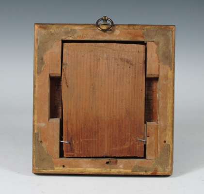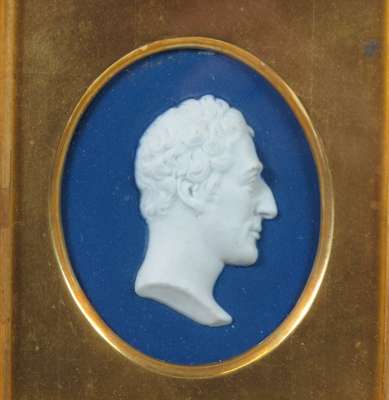 of oval form, white on a blue ground, contained within an ornate gilt frame