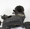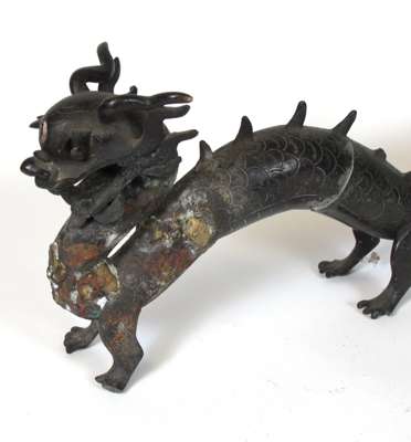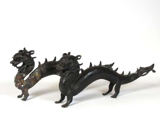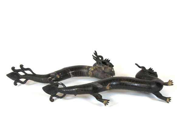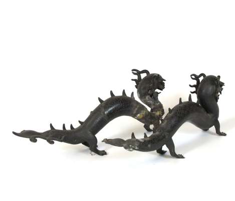 standing with one foot raised on a bowl with a lotus blossom on his back, 20cm high; and two bronze dragons, each of elongated form, standing on four feet, 37cm long (3)