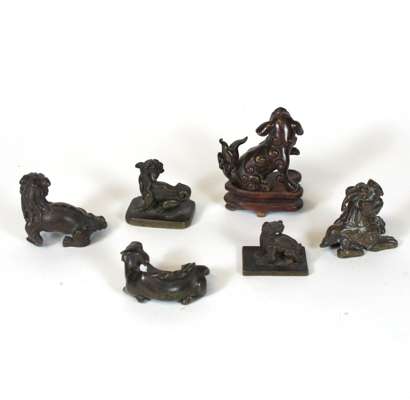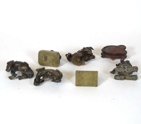 comprising: five small figures of Buddhistic lions, 3.5cm - 5cm; and a figure of a recumbent oxen, 2cm high (6)