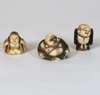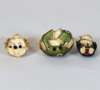 a seated figure of a man, green stained jacket, character marks, seal mark, 3cm high; a seated figure of a woman with a mother-of-pearl inlaid belt, character marks, seal mark, 3cm high; and a figure of a standing man, carved wood jacket, seal mark, 4cm high (lacking hands) (3)