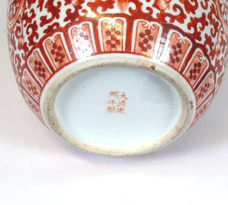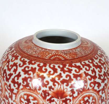 of ovoid form, decorated with scrolling lotus decoration, red six character mark to base