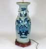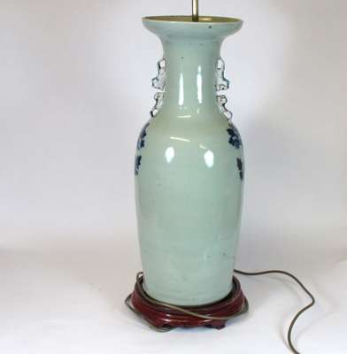 of baluster form with twin handles, decorated with flowers and peacocks on rock work, on a hardwood stand, converted to a lamp