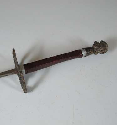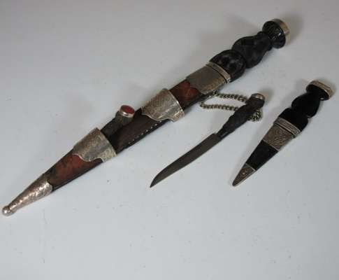 brass hilt and scabbard mounts, blade 86cm long; a basket hilted broadsword, blade 84cm long; three fencing foils; two scabbards; two dirks; a sghian dubh and an Islamic dagger (11)
